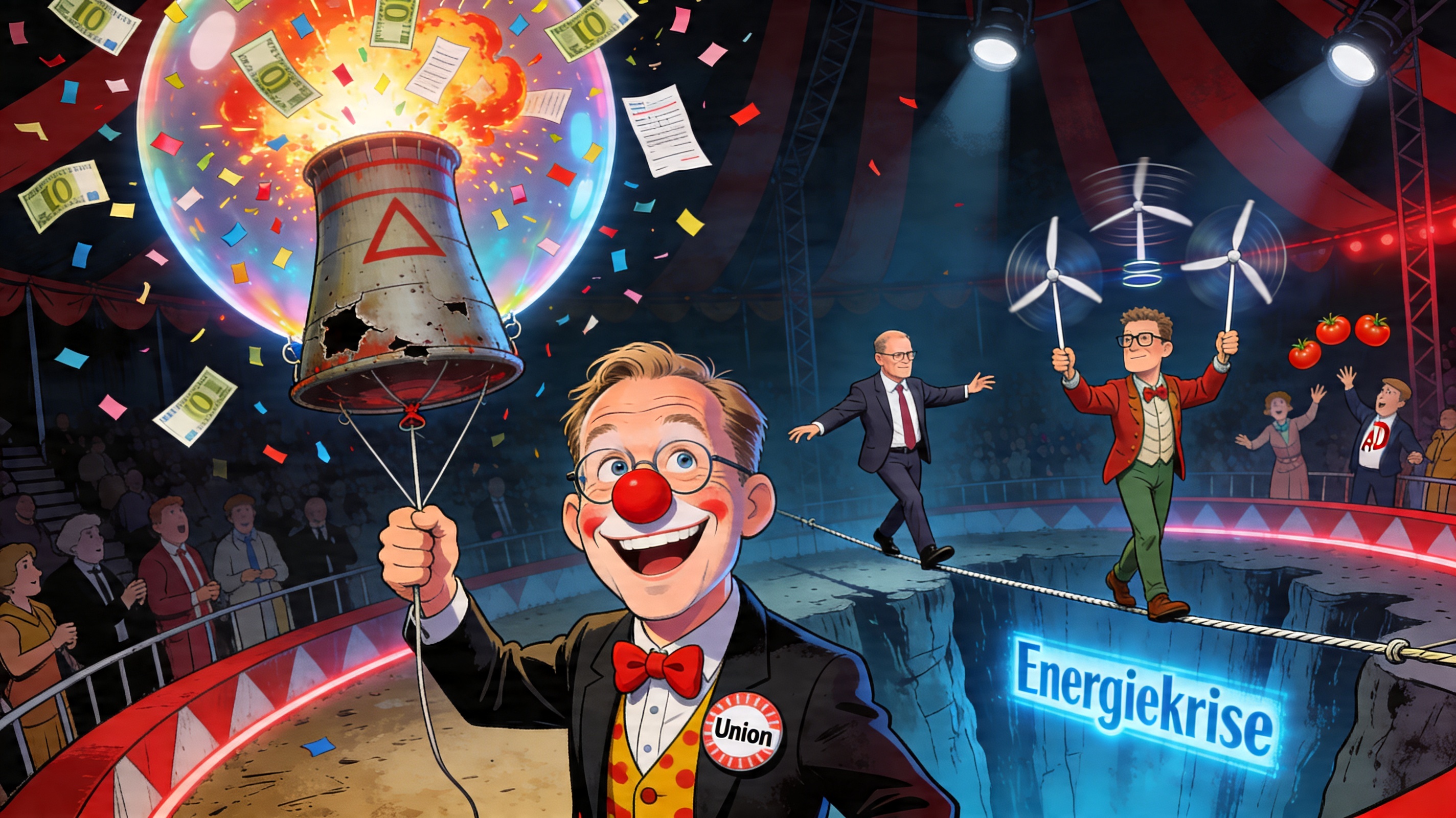 Der Vorschlag lädt zu Eskalation ein: Rechtsstreitigkeiten, EU-Rechtsbrüche, Investorenflucht. Statt klarer Energiewende – Wind, Solar, Speicher – dominiert Showpolitik, die Bürgerpreise treibt und Abhängigkeit von Russland/Qatar verlängert. Spahn als Clownskönig enthüllt das System: Opportunismus statt Strategie, wo Fachlichkeit im Kostüm ertrinkt. Zack – Vorhang zu für rationale Politik?